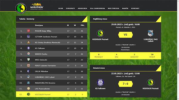 RealizacjaW pierwszej kolejności, trzymając się wytycznych Zarządu Koziołka, przygotowaliśmy zupełnie nową szatę graficzną. Doskonały materiał zdjęciowy, którym dysponował nasz klient sprawił, że praca na tym etapie była czystą przyjemnością, co raz jeszcze udowodniło rolę jaką przy projektowaniu odgrywa profesjonalna fotografia. Kolejnym etapem było wdrożenie serca strony, czyli naszego autorskiego systemu do zarządzania treścią. Tu zastosowaliśmy automatyzację wszędzie tam, gdzie było to możliwe. Wszystkie wyniki meczy, terminarze i tabele dla poszczególnych zespołów, raz na dobę aktualizują się "same" :) Tworzenie planu zajęć zautomatyzowaliśmy do tego stopnia, że wprowadzenie harmonogramu dla wszystkich drużyn zajęło nam jakieś... 5 minut :) A dokładniej musieliśmy wprowadzić 9 (słownie: dziewięć!!!) pozycji. Pozostałe 596 (!!!) rekordów dodało się automatycznie, tworząc plan zajęć dla wszystkich roczników na najbliższe 2 miesiące :) Sami pomyślcie, jaka to oszczędność czasu, który można spożytkować na inne aktywności!